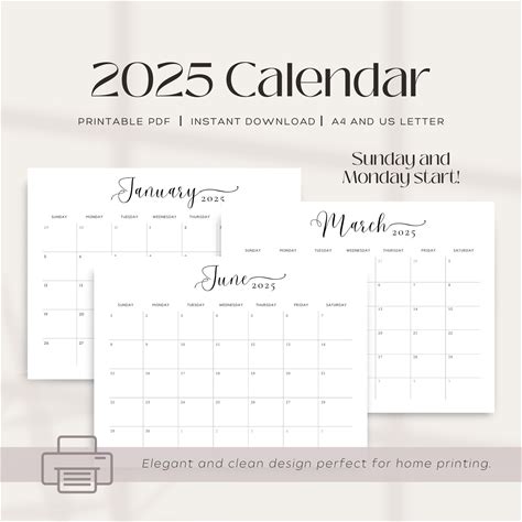 Minimal Printable 2025 Monthly Calendar | Minimalist Design | Sunday & Monday Start