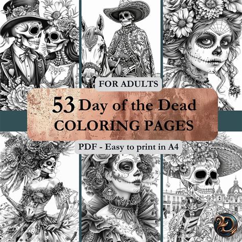 53 Day Of The Dead Coloring Pages - Adults Coloring Book, Mindfulness Coloring Sheets, Instant Download, Printable PDF File