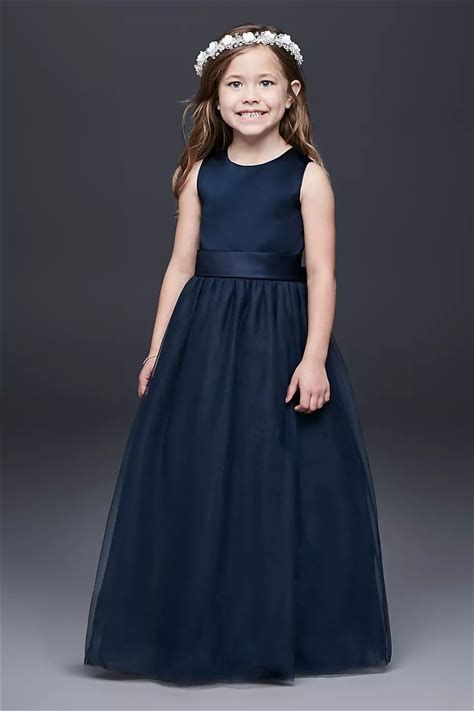 David's Bridal Girls Marine Satin Flower Dress With Tulle Skirt In Size: 5