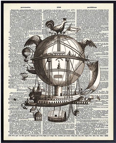 Steampunk Dirigible Airship - Cool Rustic Upcycled Dictionary Wall Art Print - Gift For Steampunk Hot Air Balloon Fans - Unique Goth Gothic Home Decor
